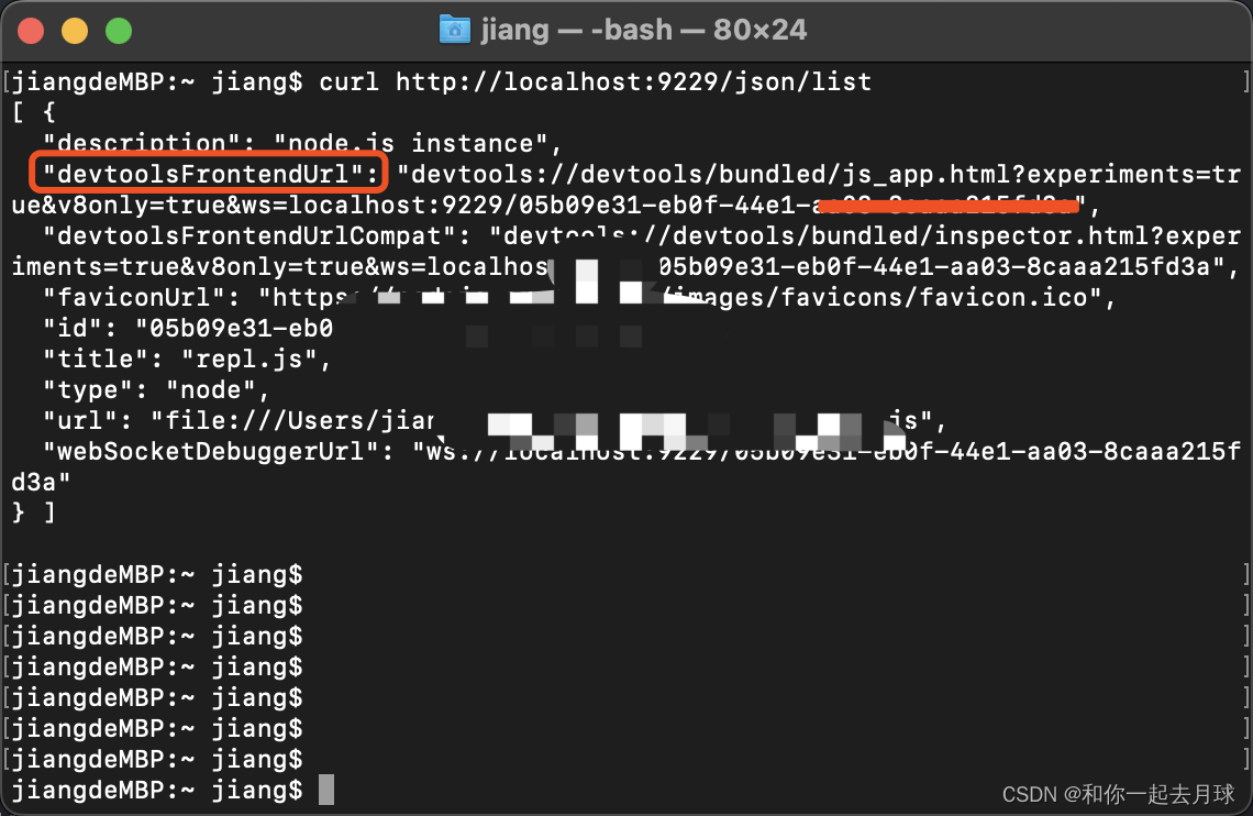 - 方法2:从/json/list下,复制devtoolsFrontendUrl对应的内容或--inspect 提示文本并粘贴到 Chrome中。