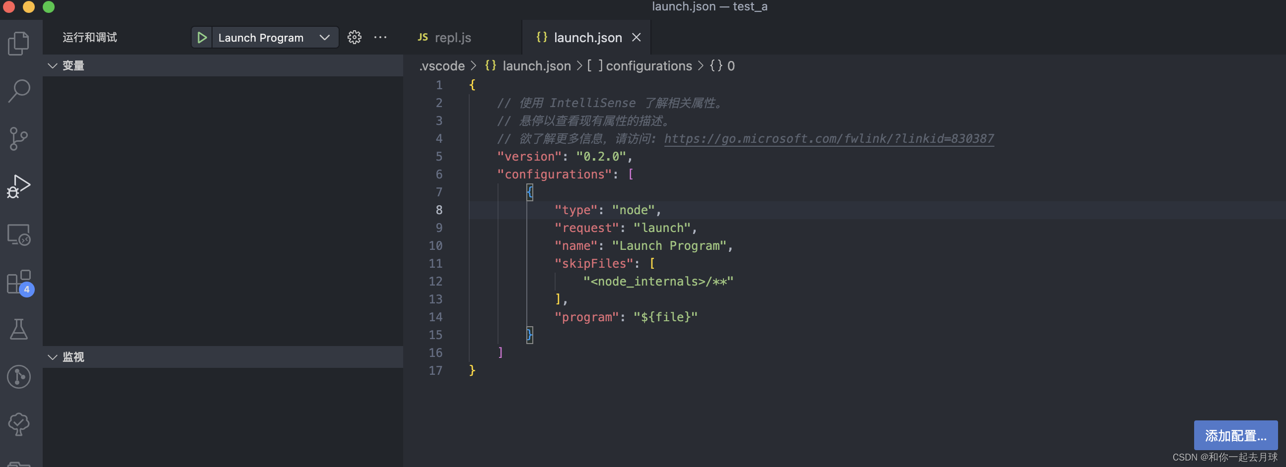 - 在 Debug 面板中,点击“设置图标”,打开 .vscode/launch.json,选择 "Node.js" 进行初始化构建。