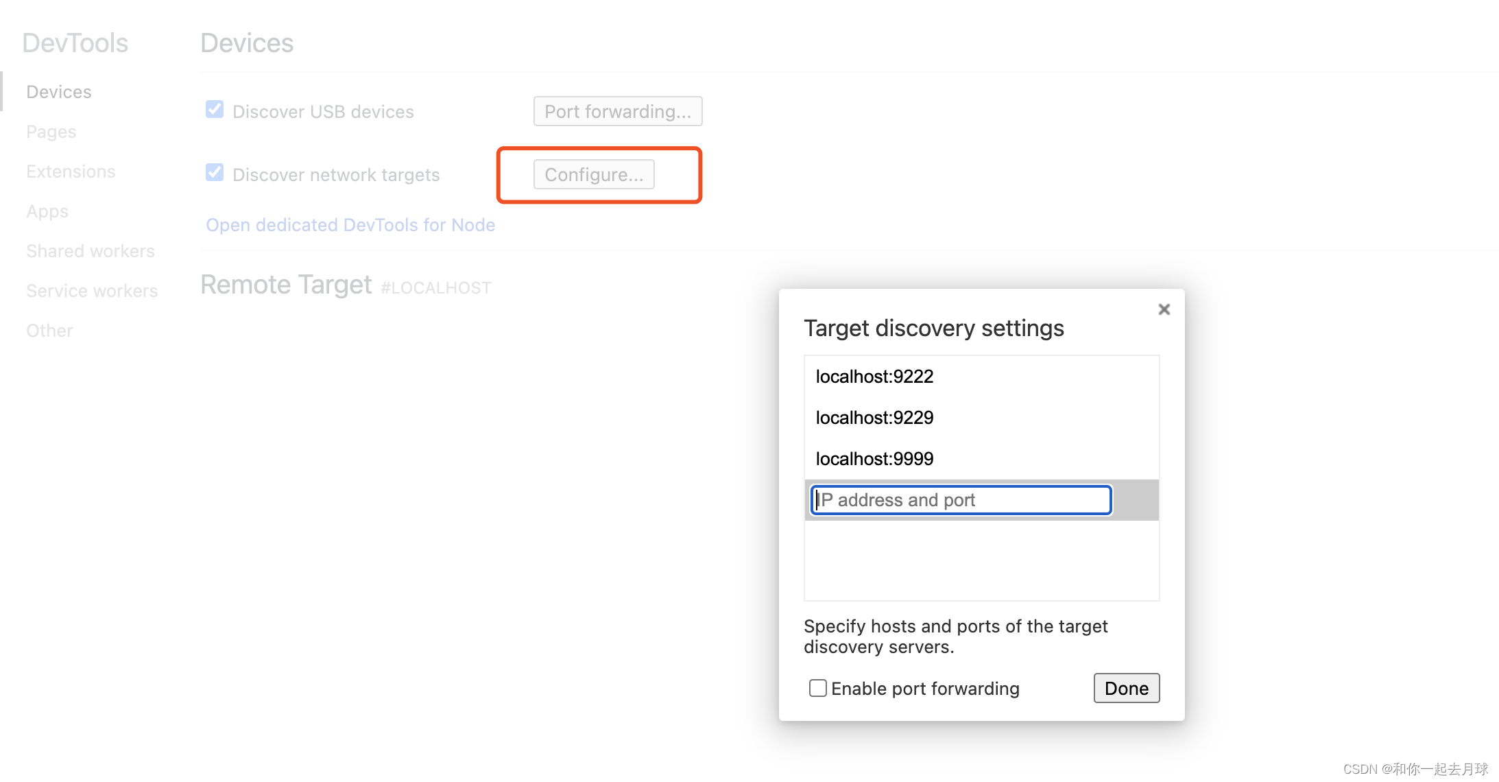 - 方法1:在基于Chromium 内核的浏览器中打开chrome://inspect,或在Edge浏览器下打开 edge://inspect,点击配置按钮确,输入你目标主机的ip和端口号