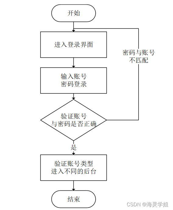 登录流程是该系统的第一个流程,登录的第一步是输入账号、密码登录,系统会验证账号与密码是否正确,正确时系统会判断账号类型再进入不同的后台;不正确时,会返回到登录的第一步,输入用户重新执行登录流程。该流程如图3-3所示。