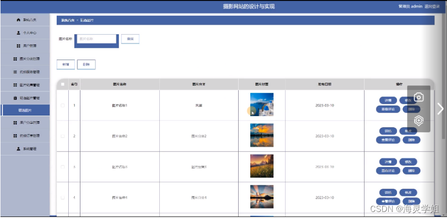 管理员点击精选图片管理。进入精选图片页面输入图片名称可以新增或删除精选图片详细信息,并进行详情,修改,查看评论或删除操作。如图5-12所示: