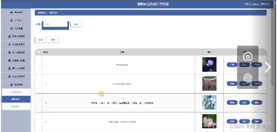 管理员点击系统管理,进入系统管理页面可以对轮播图管理进行详情或修改操作,在摄影资讯页面输入标题可以查询,新增或删除摄影资讯,并进行查看详情,修改和删除等操作。如图5-14所示: