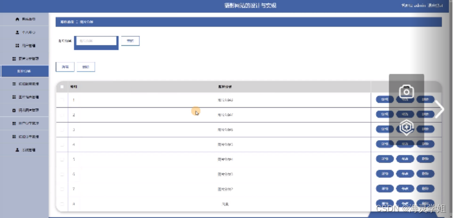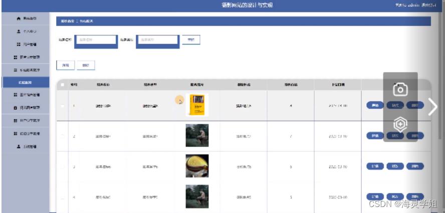 管理员点击约拍服务管理。进入约拍服务页面输入服务名称、服务类型可以查询,新增或删除作品精选信息,并进行查看详情,修改和删除操作。如图5-10所示: