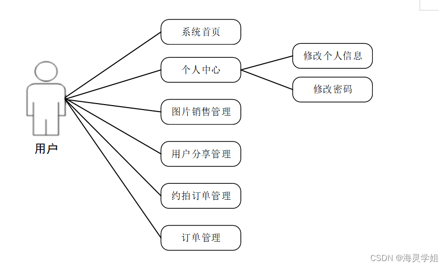 用户用例图根据用户的需求进行分析,包括用户系统首页、个人中心、图片销售管理、用户分享管理、约拍订单管理、订单管理等。用户用例图如下所示: