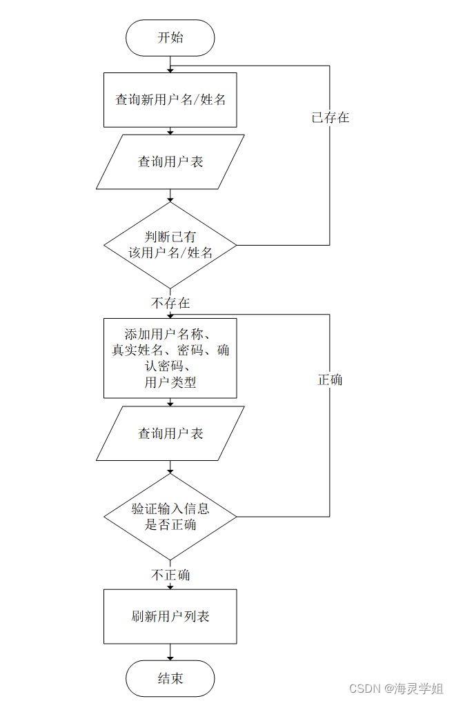 添加新用户的流程是先查询新用户名是否已存在,如已有该用户名,需重拟用户名并同时输入新用户的其它信息,添加新用户到数据库时会先验证数据是否完整,信息都正确且完整时,返回并刷新用户列表;信息不正确时,会返回输入信息的那一步。该流程如图3-4所示。