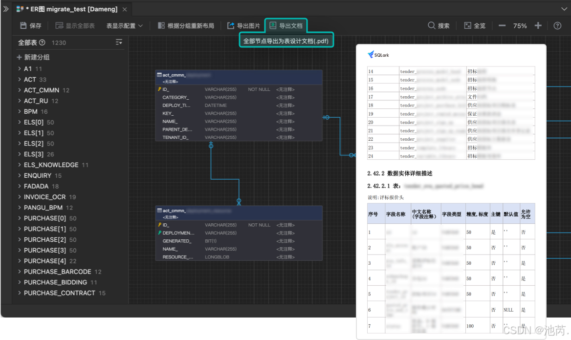 众所周知, ER 图(实体关系图)可以帮助开发者、DBA 以及项目团队更好地理解数据库的结构和数据库对象之间的关系。今天使用了一款新的数据库开发和管理工具-SQLark,发现SQLark提供免费导出达梦数据库的表设计文档的功能,这意味着用户无需支付额外费用即可获得完整的数据库设计文档,对于预算有限的团队或个人开发者来说是一个非常好用的福利功能!