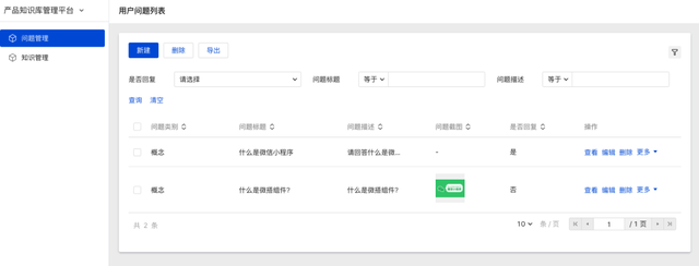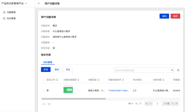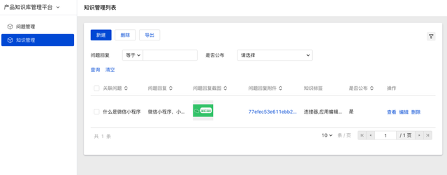 知识管理包含:知识列表、知识查询、知识新建、详情查看、编辑/删除等能力,用户问题的回复内容都会沉淀成产品知识,通过产品知识管理模块进行维护。