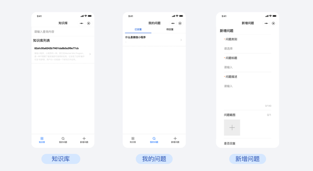 产品知识小程序使用目标对象是普通用户,主要功能包括知识库、我的问题和新增问题。