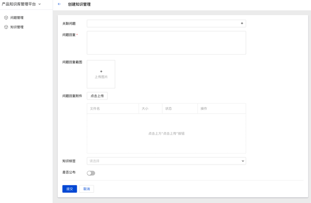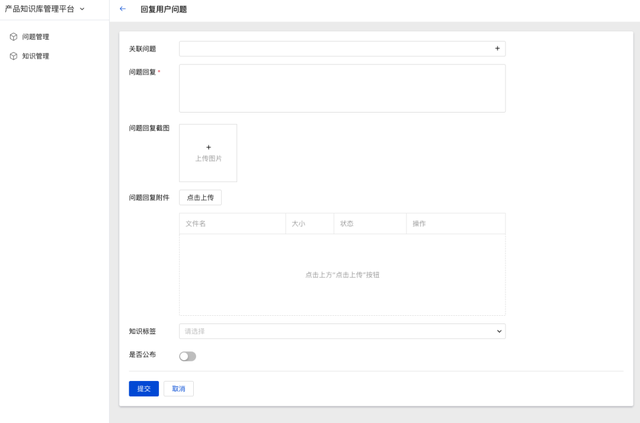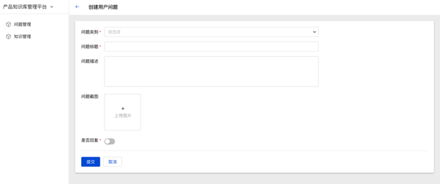 内部员工也可以在产品知识库平台上新建问题,新建问题页面字段包括问题类别、问题标题、问题描述、问题截图等。