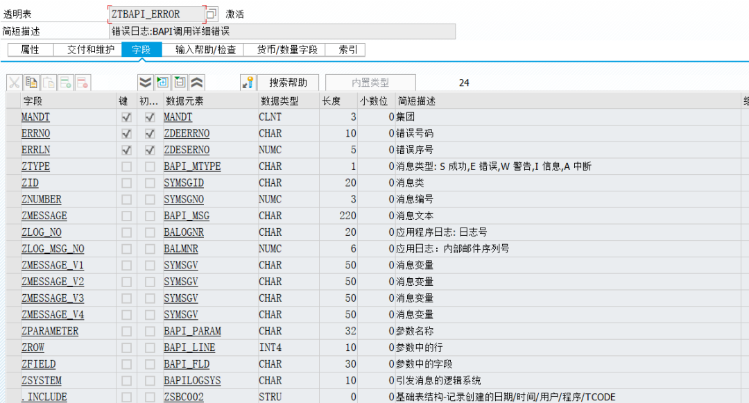 所有BAPI返回的消息附加该错误ID后写入表ZTBAPI_ERROR中.(类似于标准日志功能)