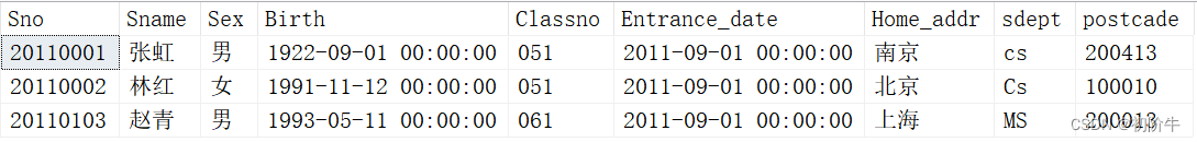 insert into student values ('20110103','赵青','男','1993-05-11','061','2011-09-01','上海','MS','200013');