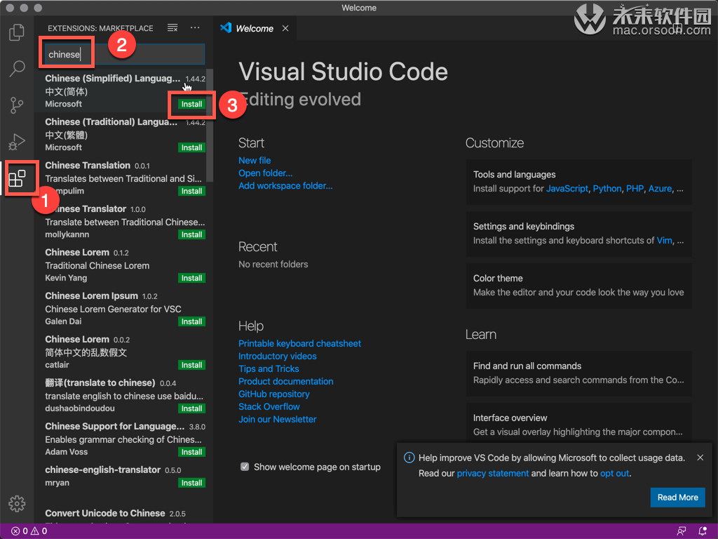 打开Visual Studio Code软件后,点击箭头1⃣️所指的位置,然后在2⃣️搜索框输入【chinses】,然后点击3⃣️简体中文后的【install】。