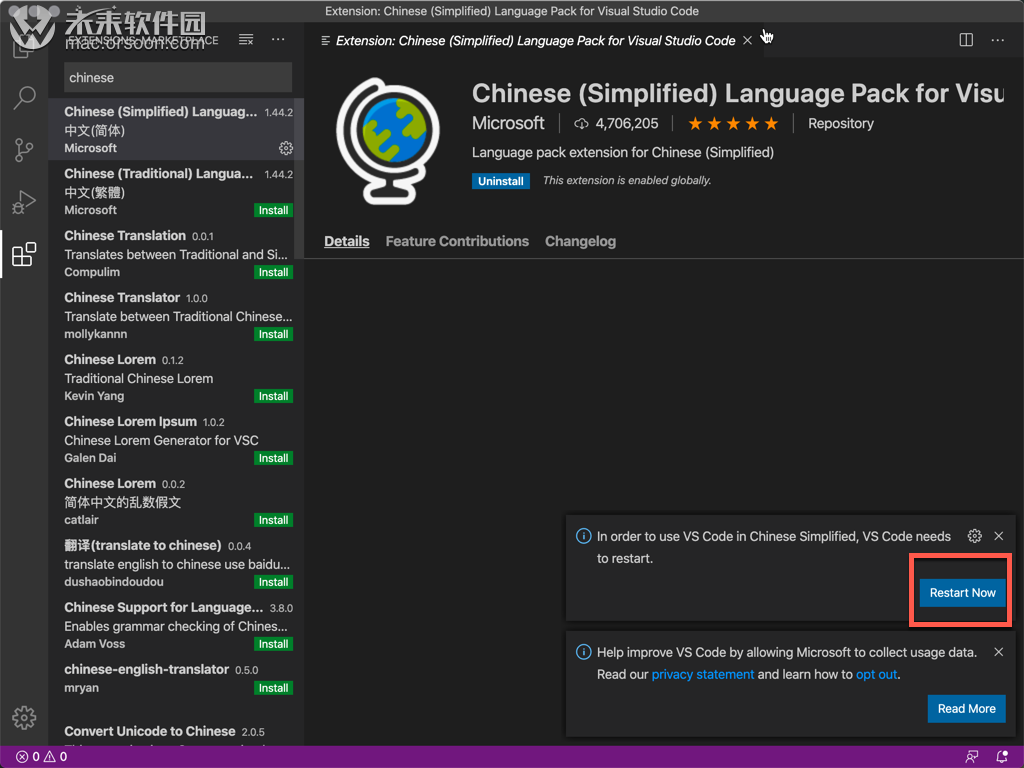 Visual Studio Code for macOS 是一款现代 Web 和云应用的跨平台源代码编辑器。强大的插件市场可以让你完全自定义你的专属编辑器。VSCODE,小编只想说,太好用啦!VS Code 升级新版后,默认仅仅支持英文,下面开始中文语言设置教程:Visual Studio Code 1.54.2 中文版:https://mac.orsoon.com/Mac/163141.html
