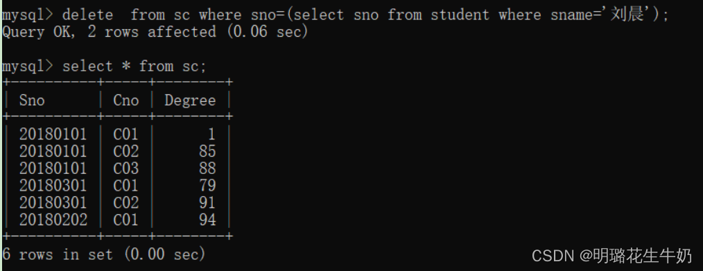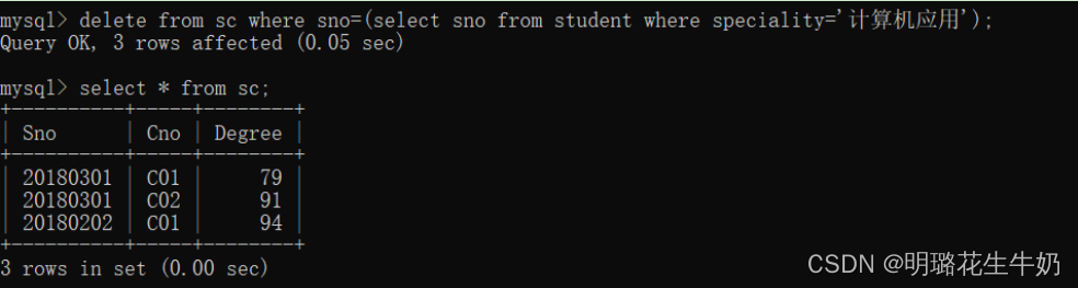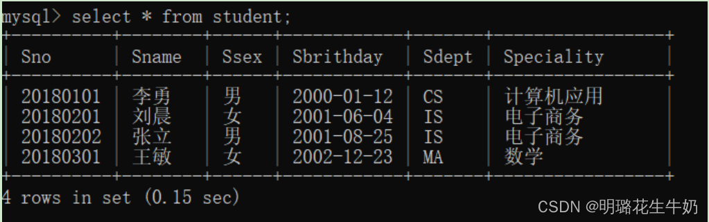 数据更新1.向 Student 表中插入记录('20180203','张静','女','2001-03-21','CS' ,'电子商务')首先看一下student内的记录:插入数据这很容易2.插入学号为‘20180302’,姓名为'李四'学生信息3. 把男学生记录保存到表 TS 中首先我们应该明确的是我们当前的数据库里没有TS表:因此我们需要创建TS表,创建的同时把男学生的记录插入这个表中:4.