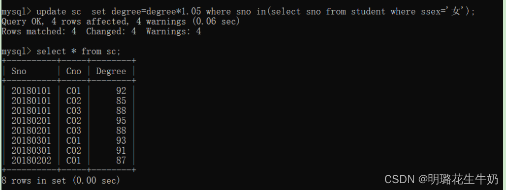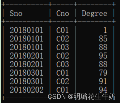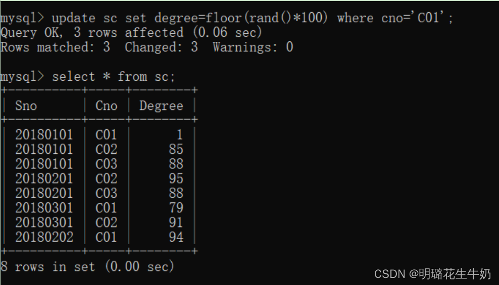 (2)将’c01’课程的成绩更新为随机成绩数据,成绩取值范围为0到100之间。