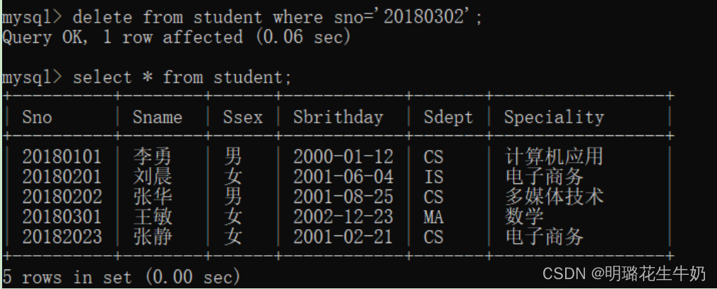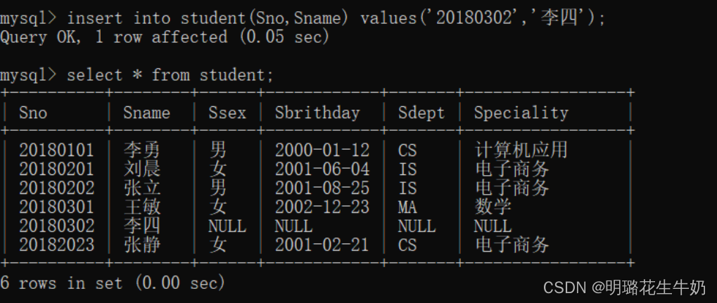 2.插入学号为 ‘20180302’,姓名为'李四'学生信息