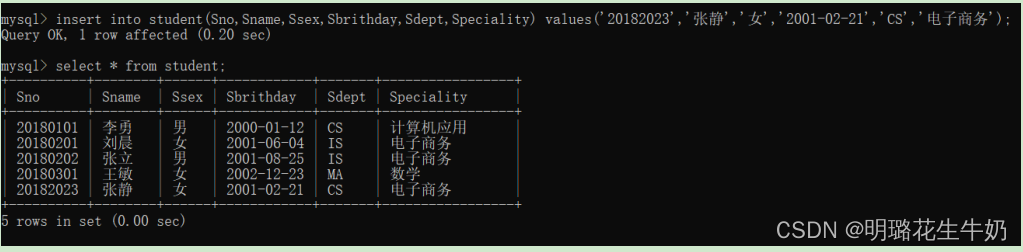 1.向 Student 表中插入记录('20180203','张静','女','2001-03-21','CS' ,'电子商务')