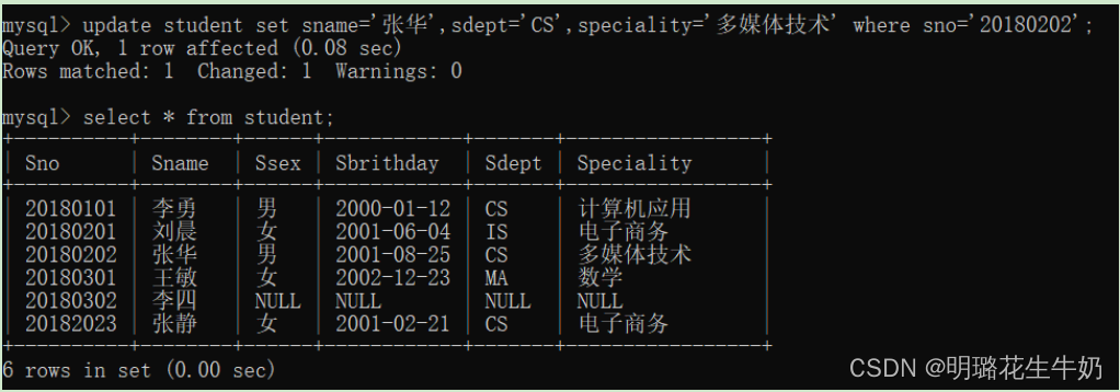 4. 将学号为' 20180202' 的学生姓名改为'张华',系别改为“CS”,专业改为“多媒体技术”