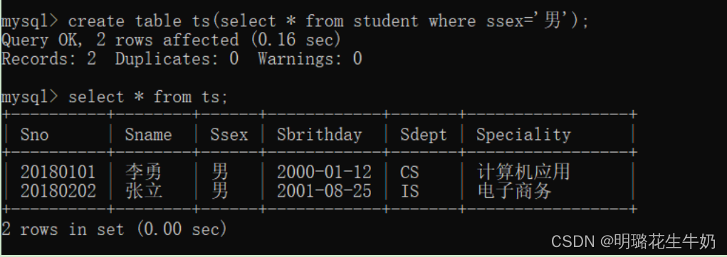 因此我们需要创建TS表,创建的同时把男学生的记录插入这个表中: