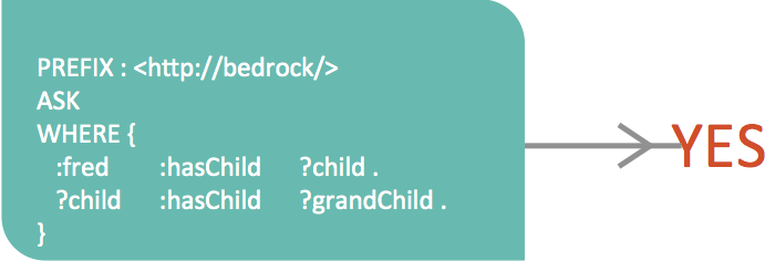 正如您在绿色框中的查询中所见,Fred 的孩子的孩子是他的孙辈。因此,通过匹配 Fred 的孩子然后匹配他孩子的孩子,可以很容易地用 SPARQL 编写查询。查询ASK返回“是”,所以我们知道 Fred 有孙子。