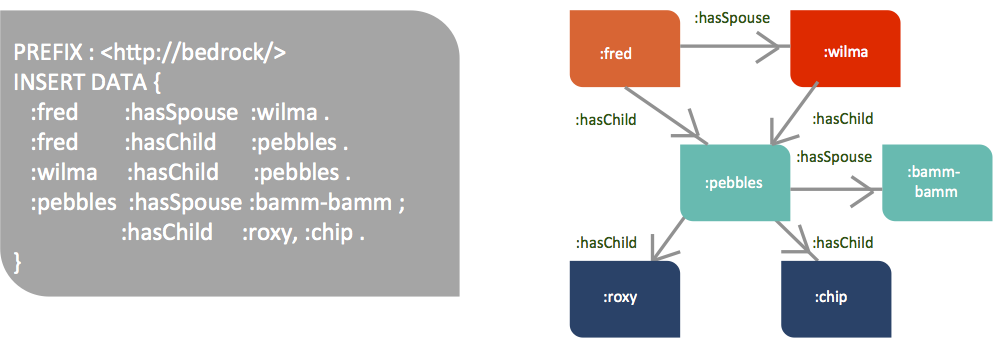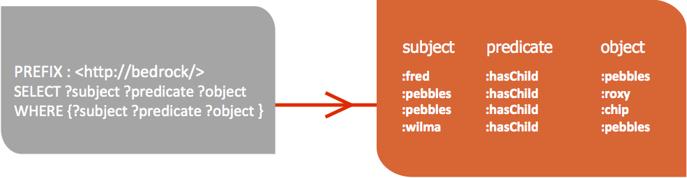 正如您在灰色框中显示的示例中所见,我们编写了一个 SPARQL 查询,其中包含 PREFIX、SELECT和WHERE。红色框显示响应书面查询而返回的信息。我们可以看到 Fred、Pebbles、Wilma、Roxy 和 Chip 之间的家庭关系。