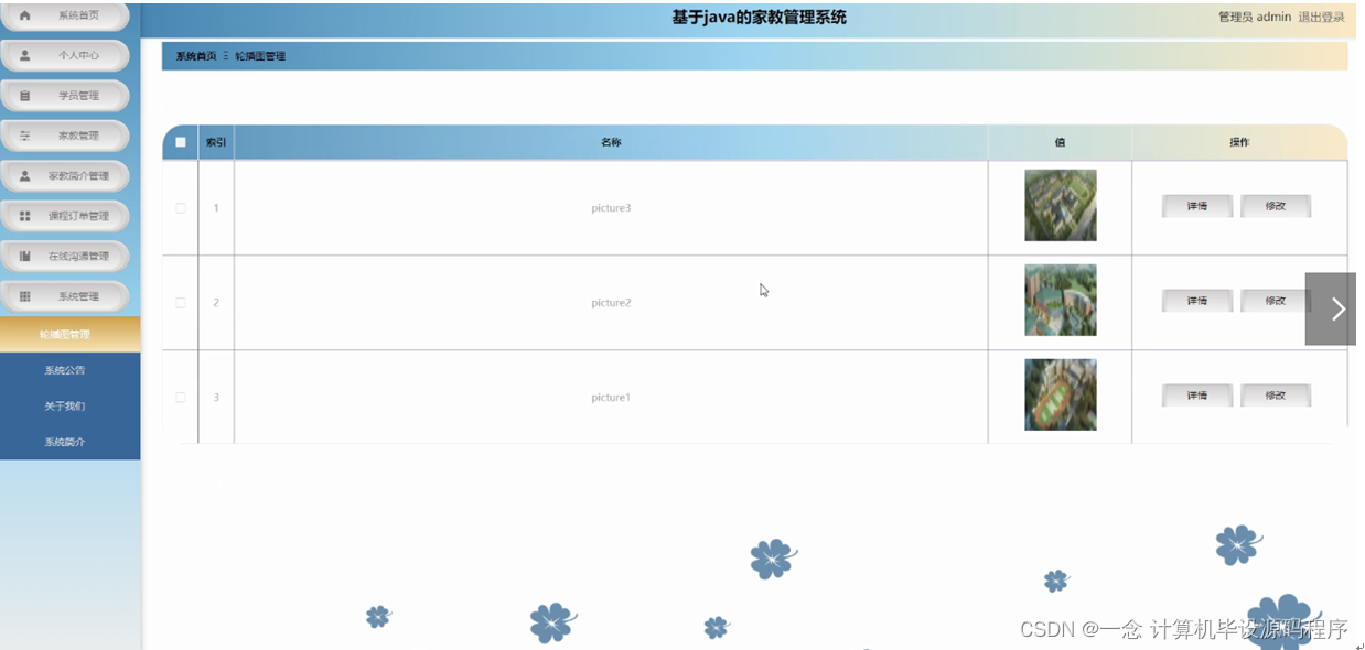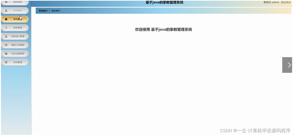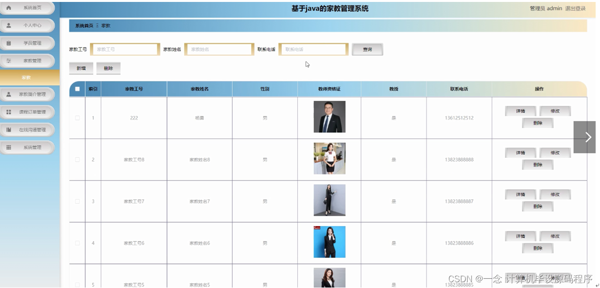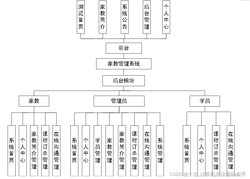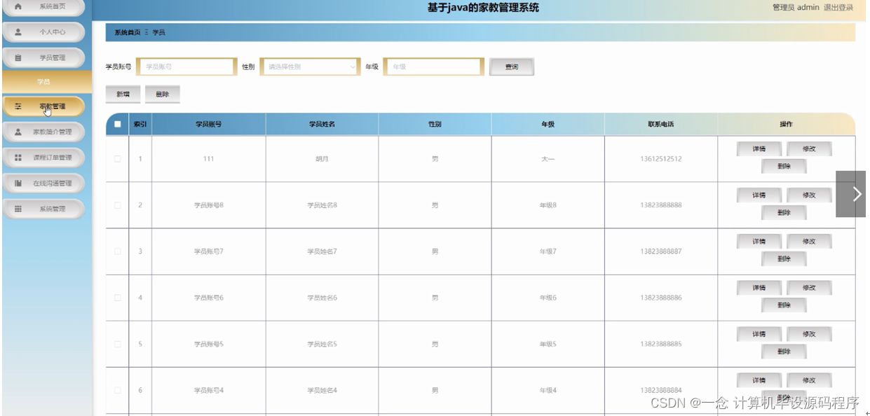 本课题要求实现一套家教管理系统,系统主要包括管理员模块和学员、家教模块功能模块。