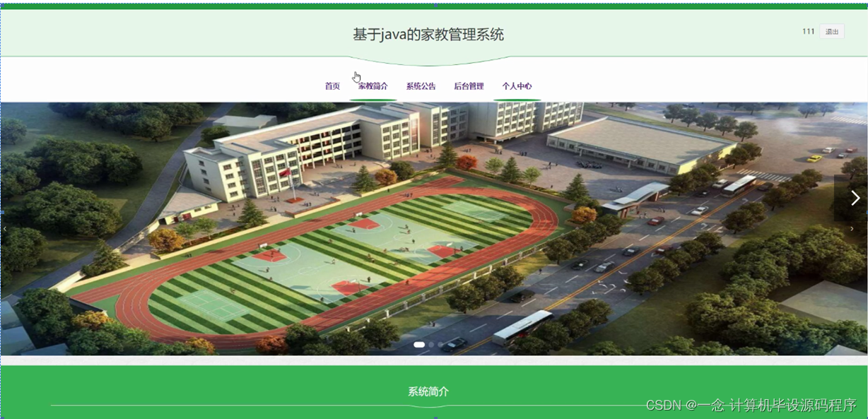 当用户打开系统的网址后,首先看到的就是首页界面。在这里,用户能够看到家教管理系统的导航条显示首页、家教简介、系统公告、后台管理、个人中心等。系统首页界面如图5-1所示: