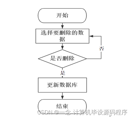 删除操作在系统中并非是必须的,可根据用户及系统的需要来决定是否添加删除功能,删除操作就是使用delete语句将数据库中的某一匹配数据删除,因为此操作会导致用户数据丢失,所以为了避免使用者误按删除键,应在用户点击删除按钮时添加一个提示确认弹窗,当用户确定要删除时,再进行数据库的操作,并且在删除操作完成后要对用户进行反馈。删除信息流程图如图3-9所示。