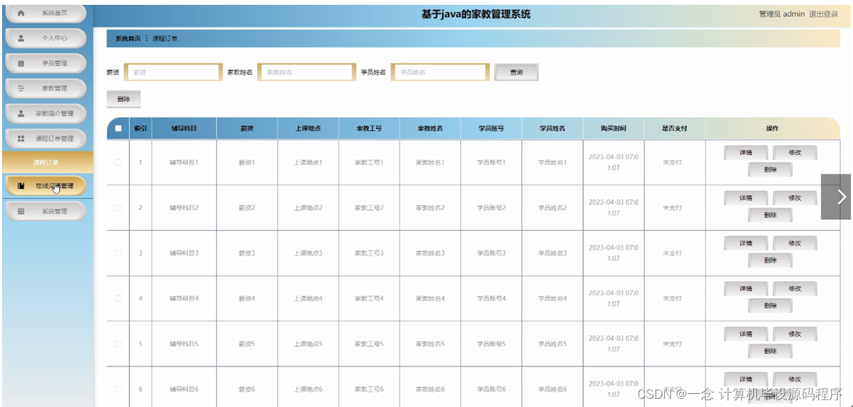 管理员点击课程订单管理,在课程订单管理页面对辅导科目、薪资、上课地点、家教工号、家教姓名、学员账号、学员姓名、购买时间、是否支付等信息,进行查询或删除课程订单等操作。如图5-12所示: