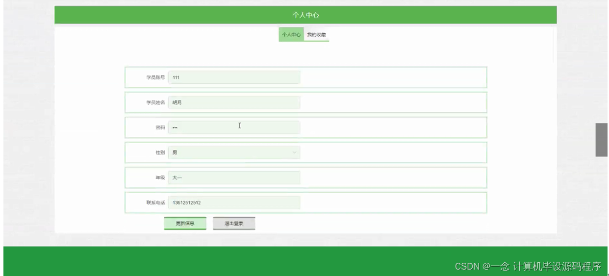 学员点击个人中心,在个人中心页面可以更新个人详细信息,还可以对我的收藏进行详细操作;如图5-6所示: