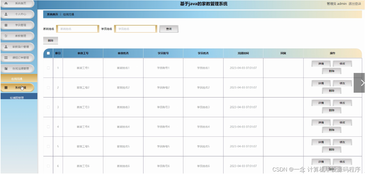 管理员点击在线沟通管理,在在线沟通管理页面对家教工号、家教姓名、学员账号、学员姓名、沟通时间、回复等信息,进行查询或删除在线沟通等操作。如图5-13所示: