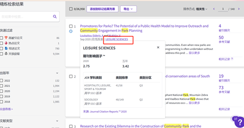 2)主题转换法,这是在确定检索词中我们最常用到的方法。城市社区公园公平性分析主要关键词为城市社区公园+公平性,公平性可以转换为公正性或可达性,即unprejudiced| impartiality| accessibility