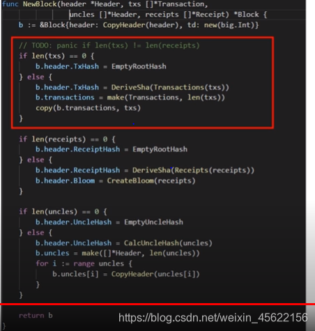 交易树的代码:创建交易树,判断交易列表是否为空,如果为空,则区块块头的哈希值也为空,否则通过调用Derivesha来得到交易树的根哈希,然后创建区块的交易列表。