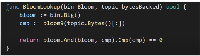 通过调用BloomLookup函数,查询bin Bloom filter有没有包含要找的第二个参数,topic,首先用刚才讲的bloom9函数把topic转换成一个bit vector,然后把他和bloom filter取add操作,看结果是否和Bit vector相等,bloom filter除了包含查找的topic还可以包含其他topic,所以要先做一个add再和自身比较,相当于判断一下我们要查找的topic在bloom filter对应的位置是不是都是1。