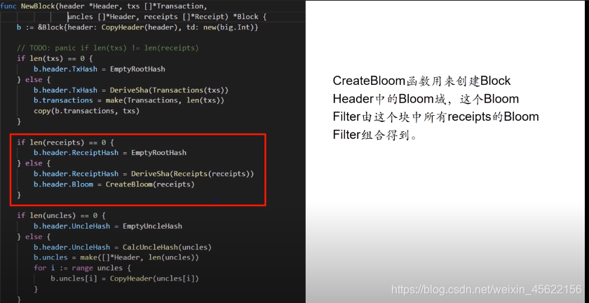这是相关的三个函数代码实现,CreatBloom函数的参数是这个区块的所有收据,for循环对每个收据调用LogsBloom函数来生成这个收据的Bloom filter,然后把bloom filter用Or合并起来得到整个区块的bloom filter。