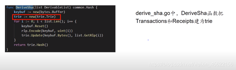 Newblock里创建了交易树和收据树,并且得到了他们的根哈希值,block.go中,Newblock 函数里调用DeriveSha来得到交易树和收据树的根哈希值。