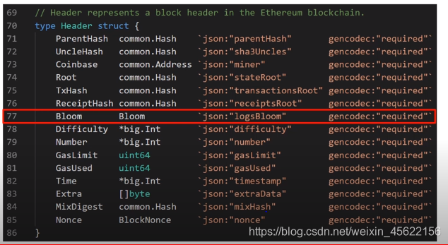 这个是区块块头的数据结构,里面这个Bloom域就是整个区块的Bloom filter,是由刚才看到的每个收据的bloom filter合并在一起得到的。