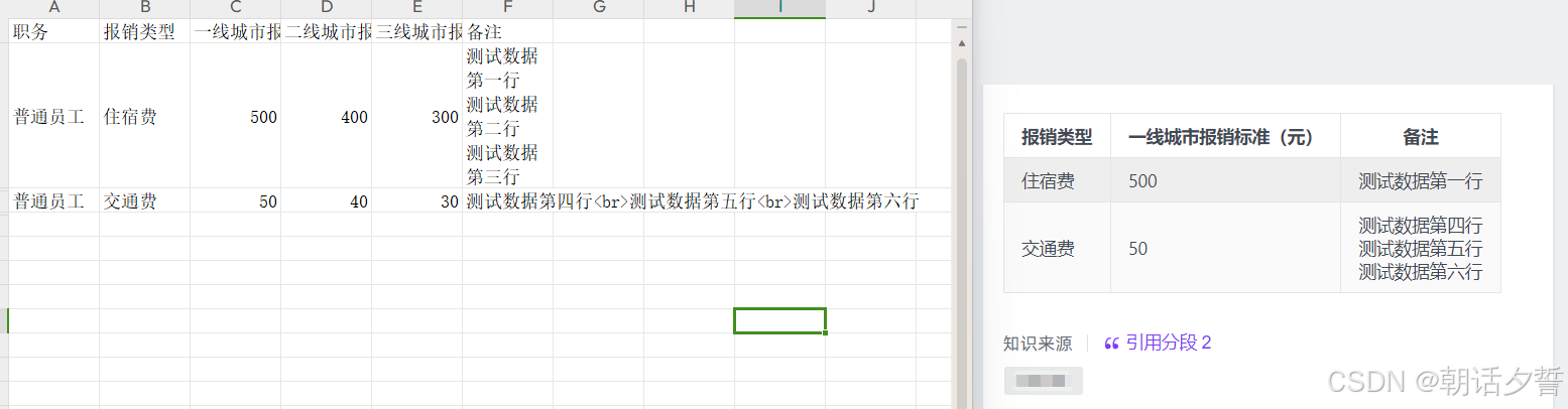 经过一番简单的研究发现如果对单元格内的数据使用回车换行的话那这个分段就会将这个数据分割开,但是我们单元格中的数据又不可能总是一句话,为了解决这个问题又进行了一番简单的研究发现如果使用<br>标签可以代替回车换行,而且输出的信息也是非常完整的,如下图。在使用MaxKB时候对于表格类型数据我们在进行导入的时候会发生导入的分段与前文并不相关联,可以说是分段分的非常的乱,如下图。推荐大家在使用表格类型的数