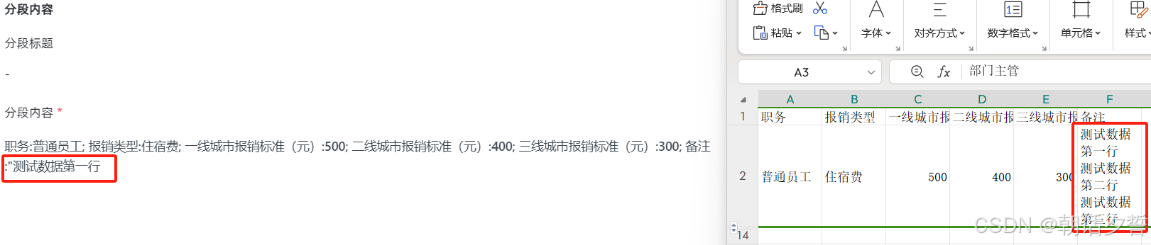 经过一番简单的研究发现如果对单元格内的数据使用回车换行的话那这个分段就会将这个数据分割开,但是我们单元格中的数据又不可能总是一句话,为了解决这个问题又进行了一番简单的研究发现如果使用<br>标签可以代替回车换行,而且输出的信息也是非常完整的,如下图。