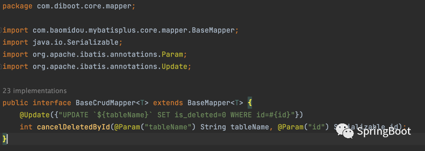 import com.diboot.core.mapper.BaseCrudMapper;import org.apache.ibatis.annotations.Mapper;@Mapperpublic interface DemoMapper extends BaseCrudMapper<Demo> {}