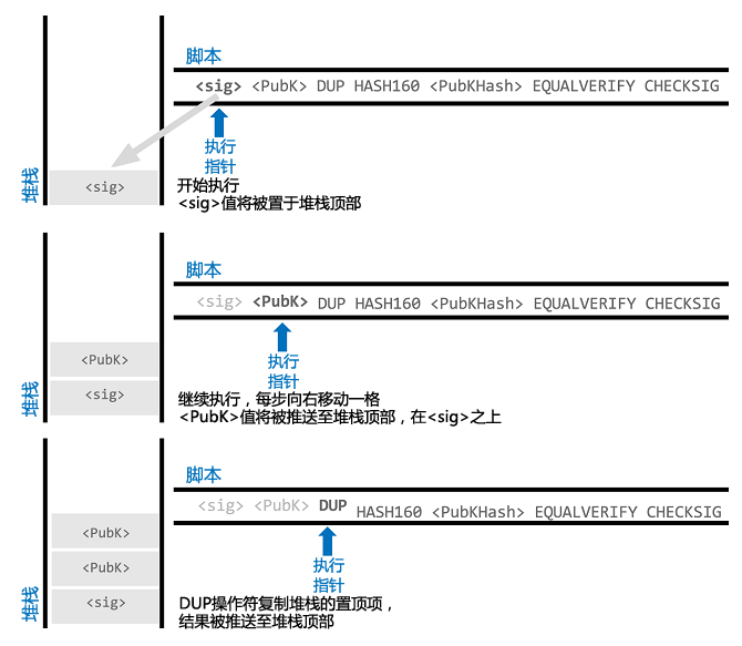 这是一种基于堆栈的执行语言,执行完后栈顶推出TRUE则表示脚本匹配。交易脚本的执行流程大致如下所示。