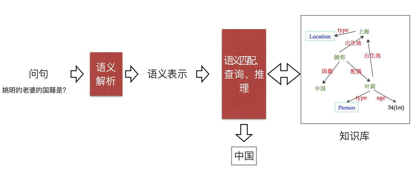 知识库问答(knowledge base question answering,KB-QA)即给定自然语言问题,通过对问题进行语义理解和解析,进而利用知识库进行查询、推理得出答案。如下图所示