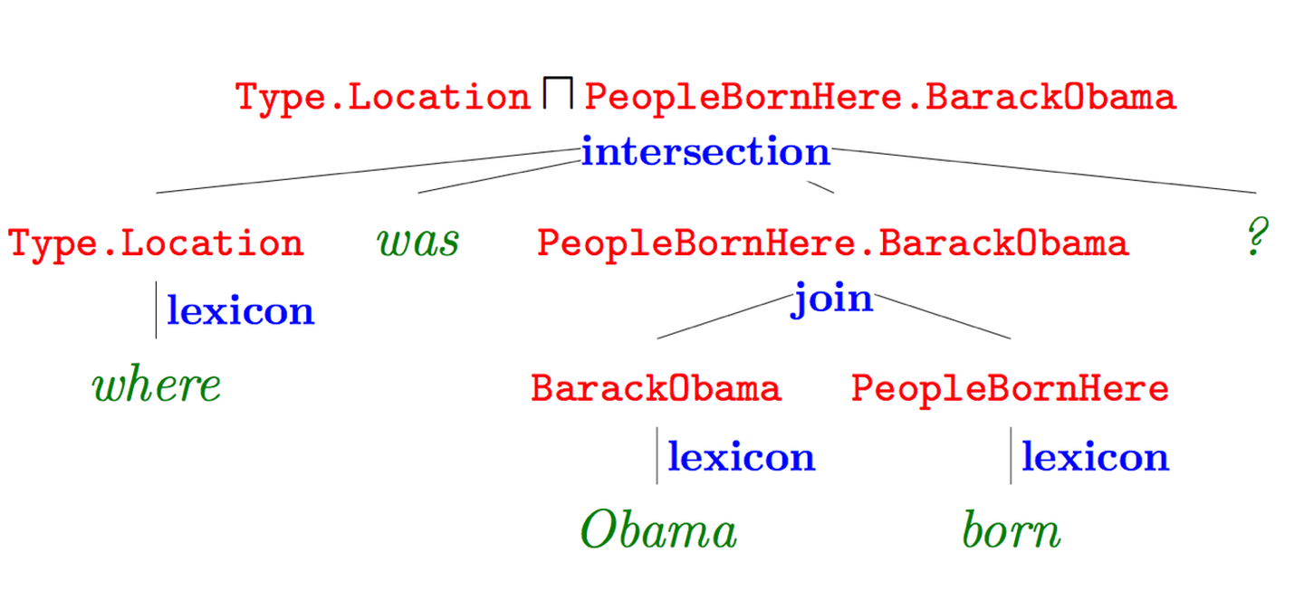 - 语义解析(Semantic Parsing):该方法是一种偏linguistic的方法,主体思想是将自然语言转化为一系列形式化的逻辑形式(logic form),通过对逻辑形式进行自底向上的解析,得到一种可以表达整个问题语义的逻辑形式,通过相应的查询语句(类似lambda-Caculus)在知识库中进行查询,从而得出答案。下图红色部分即逻辑形式,绿色部分where was Obama born 为自然语言问题,蓝色部分为语义解析进行的相关操作,而形成的语义解析树的根节点则是最终的语义解析结果,可以通过查询语句直接在知识库中查询最终答案。