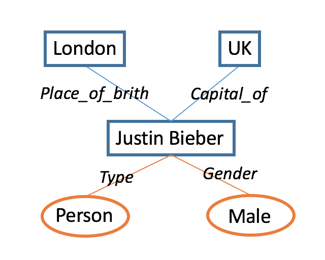 值得一提的是,有时候会把一些实体称为topic,如Justin Bieber。实体关系也可分为两种,一种是属性property,一种是关系relation。如下图所示,属性和关系的最大区别在于,属性所在的三元组对应的两个实体,常常是一个topic和一个字符串,如属性Type/Gender,对应的三元组(Justin Bieber, Type, Person),而关系所在的三元组所对应的两个实体,常常是两个topic。如关系Place_of_Brith,对应的三元组(Justin Bieber, Place_of_brith,London)。