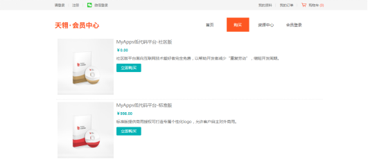 为了回馈用户,天翎MyApps平台正式上线了会员系统。用户在该平台会员商城注册会员之后,即可自由选购社区版和社区标准版两个版本的产品,免费版完全免费,标准版物美价廉。