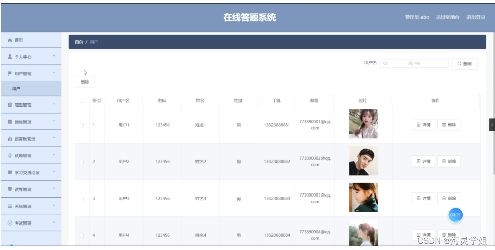 用户管理,在用户管理页面中可以查看索引、用户名、密码、姓名、性别、手机、邮箱、照片等信息,还可以根据需要进行删除等操作,如图5-9所示。