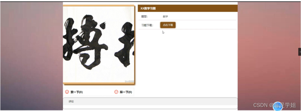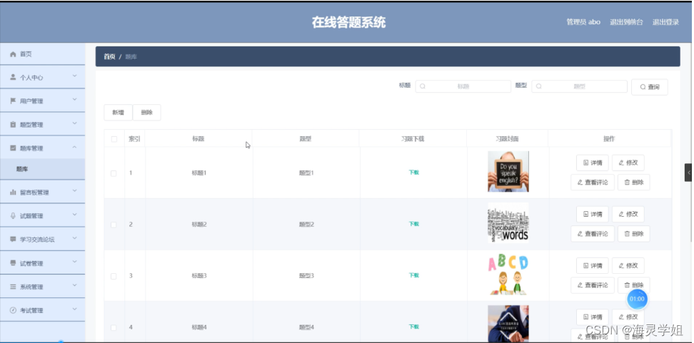 题库管理,在题库管理页面中可以查看索引、标题、题型、习题下载、习题封面等信息,还可以根据需要进行查看评论,修改或删除等操作,如下图5-11所示。