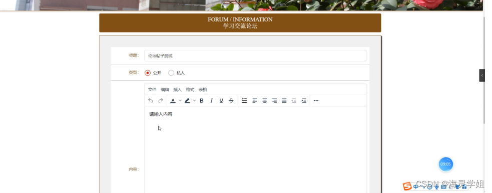 学习交流论坛,在学习交流论坛页面中通过填写标题、类型、内容等信息进行发布帖子,如图5-4所示。
