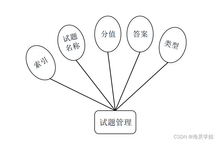 试题管理实体属性主要包括试卷、试题名称、分值、答案、类型等属性。试题管理实体属性图如图4-7所示。