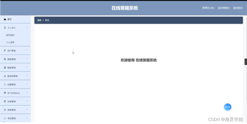 管理员登录进入在线答题系统之后,就可以对所有的信息进行查看,可以查看到首页、个人中心、用户管理、题型管理、题库管理、留言板管理、试题管理、学习交流论坛、试卷管理、系统管理、考试管理等,并且还可以对其进行相应的操作管理,如图5-8所示。